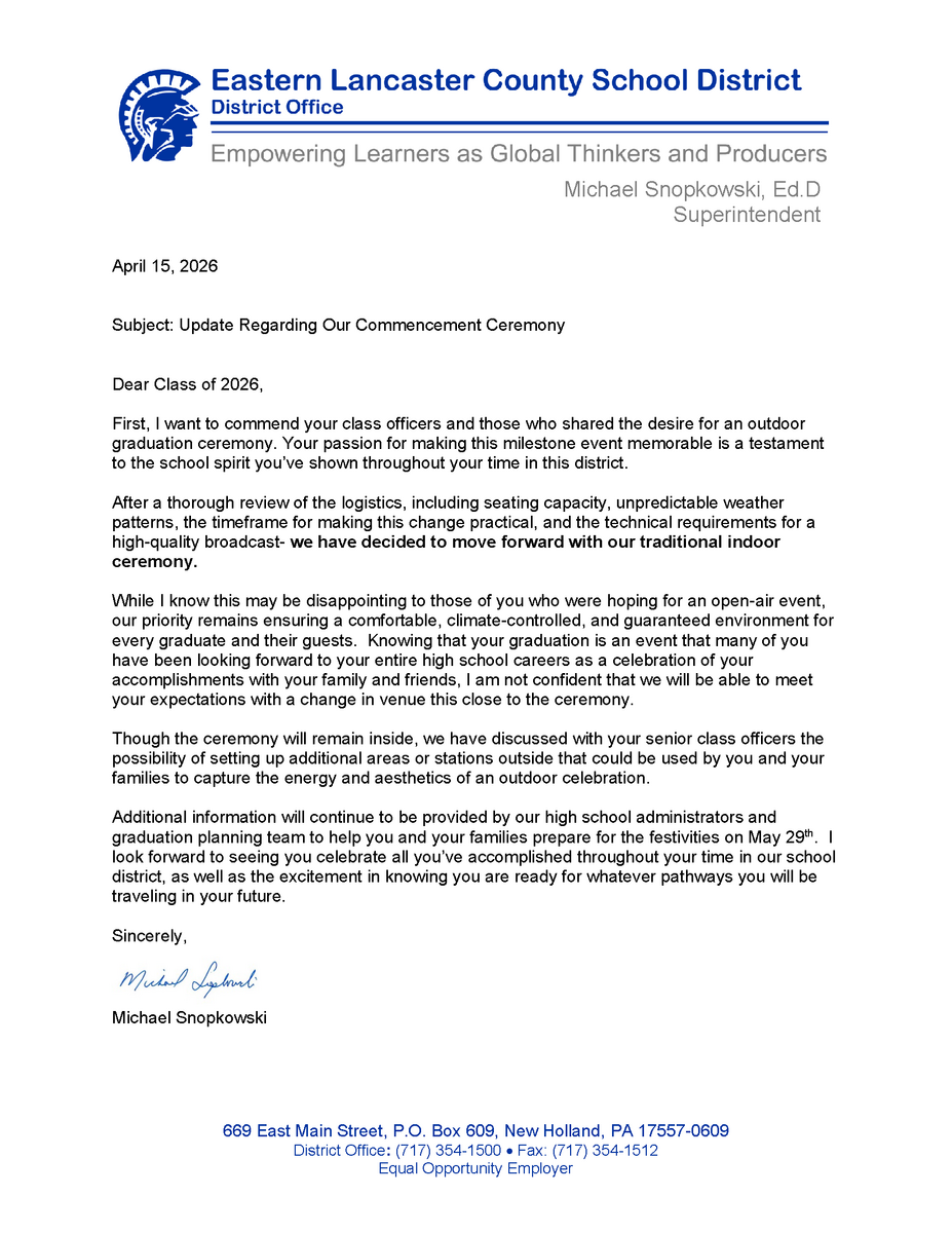 April 15, 2026Dear Class of 2026, First, I want to commend your class officers and those who shared the desire for an outdoor graduation ceremony. Your passion for making this milestone event memor...